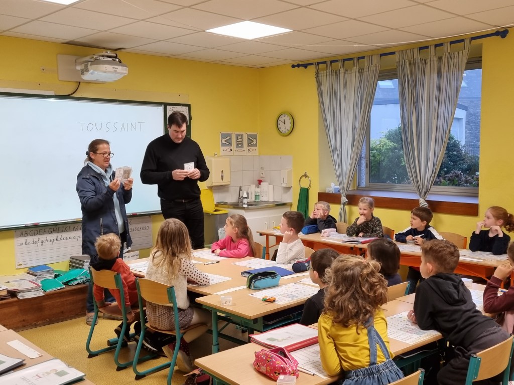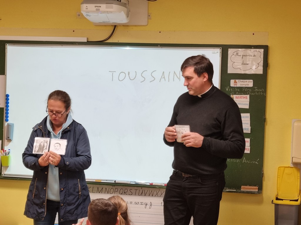 Père Jean et Anne Charlotte sont venus en classe pour nous parler de la Toussaint.
