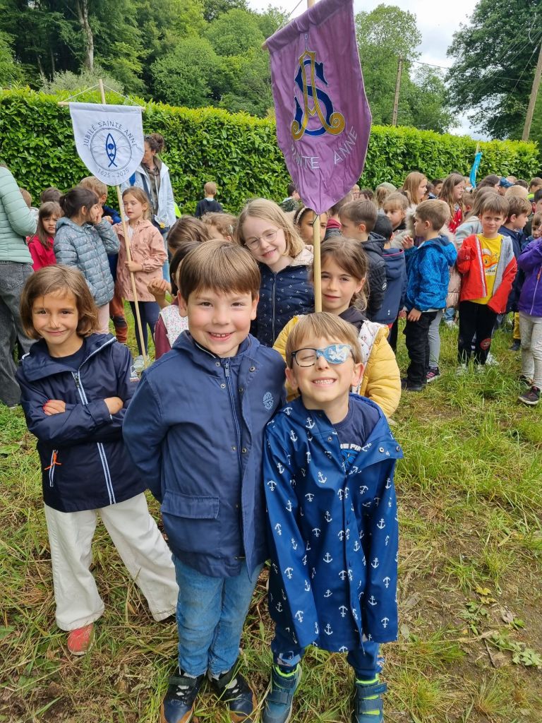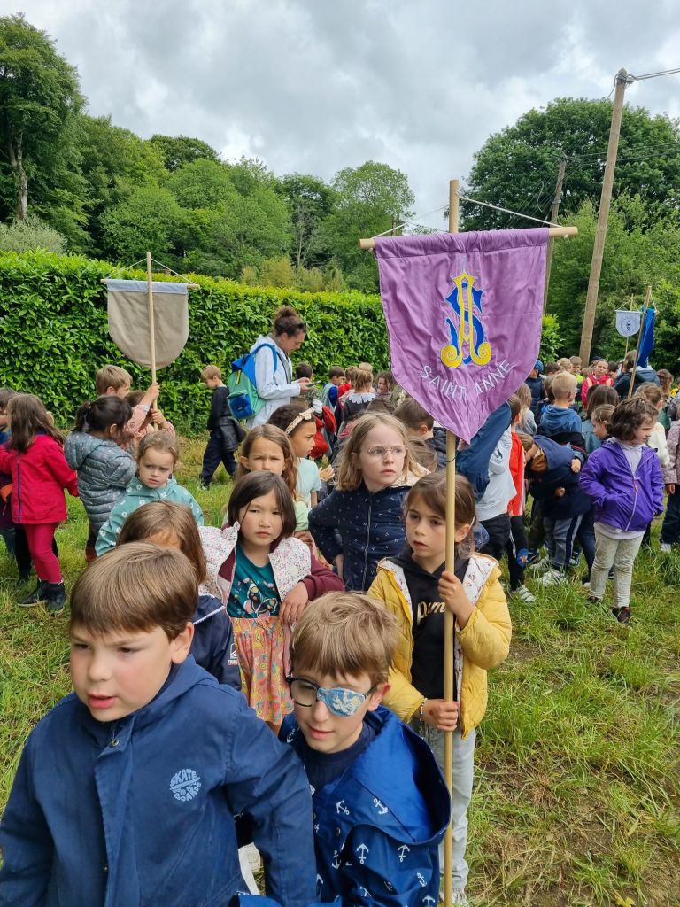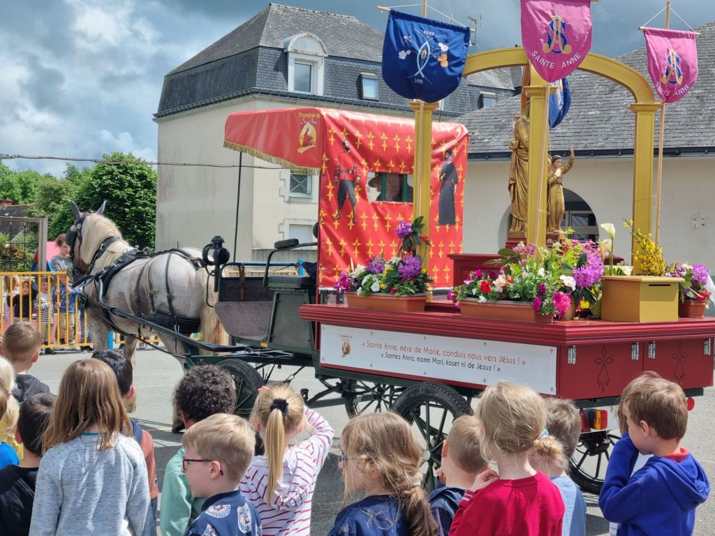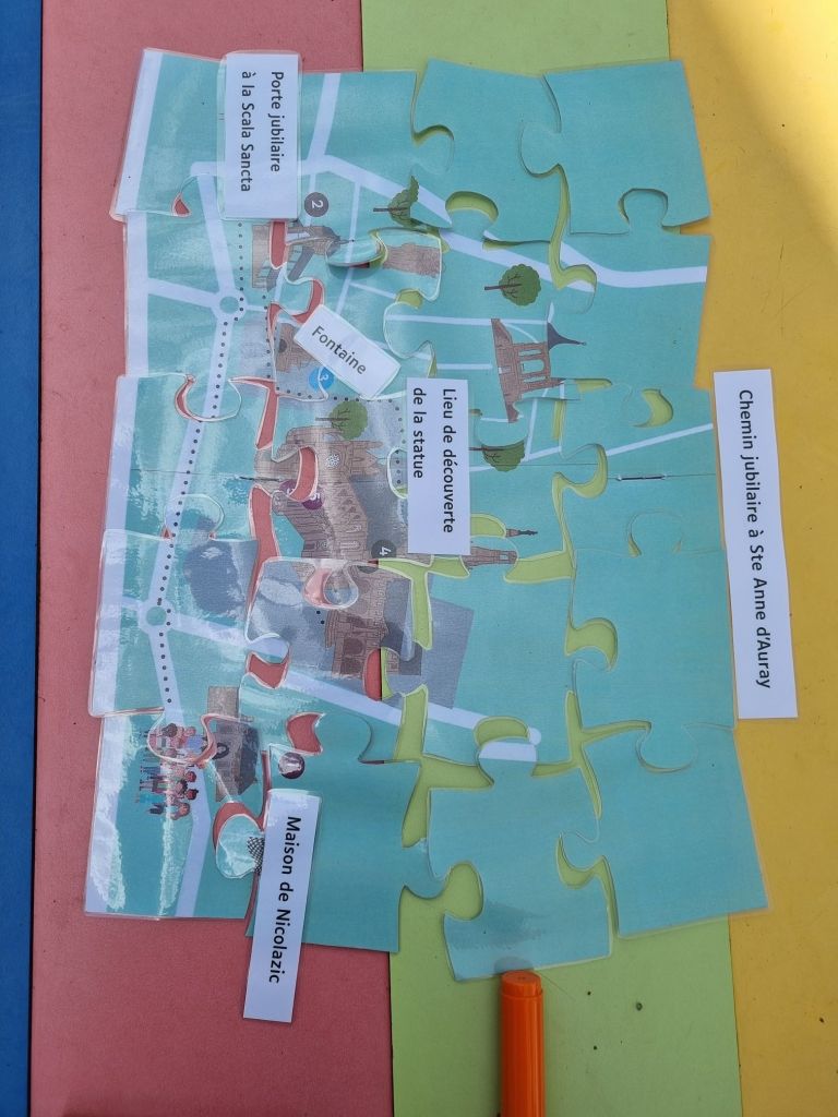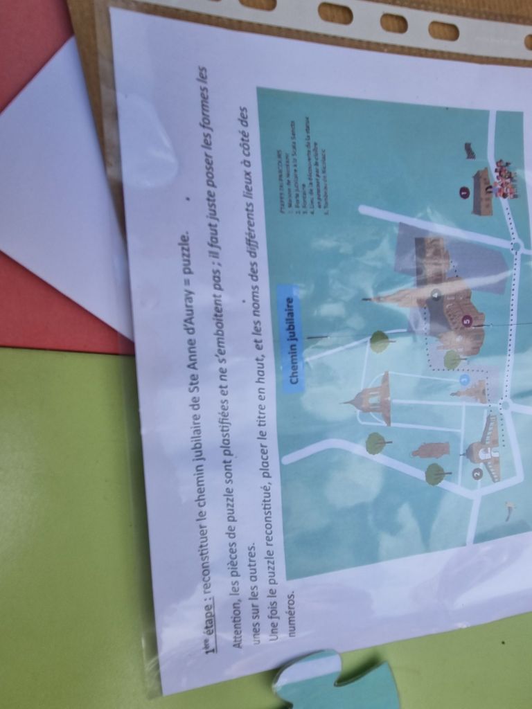 Aujourd’hui nous sommes allés rejoindre la calèche et suivre la Troménie jusqu’à l’école. Nous avons ensuite par groupe reconstituer le puzzle du chemin jubilaire de Sainte-Anne. Enfin nous sommes allés à l église pour une petite célébration.